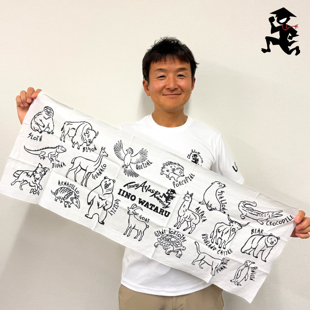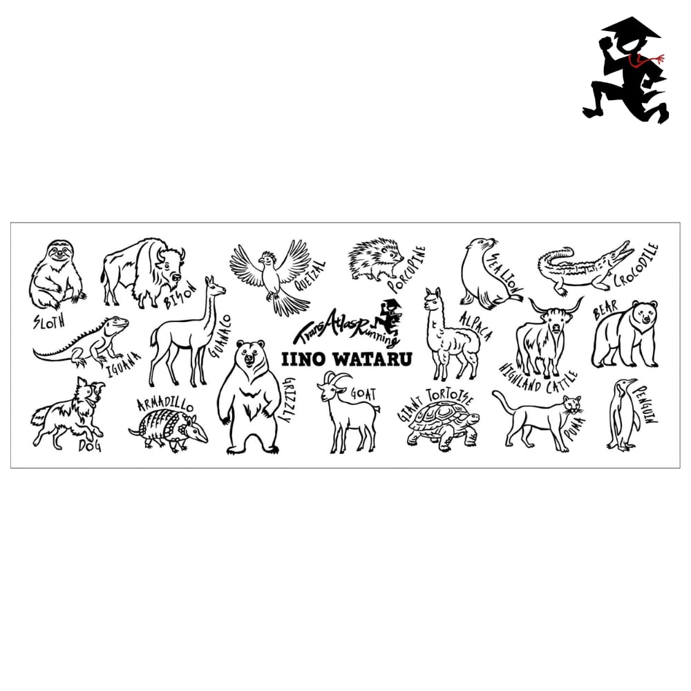 南北アメリカ大陸を走る中でいいのわたる選手が出会った動物たちを、かわいい絵柄で手ぬぐいに落とし込みました。